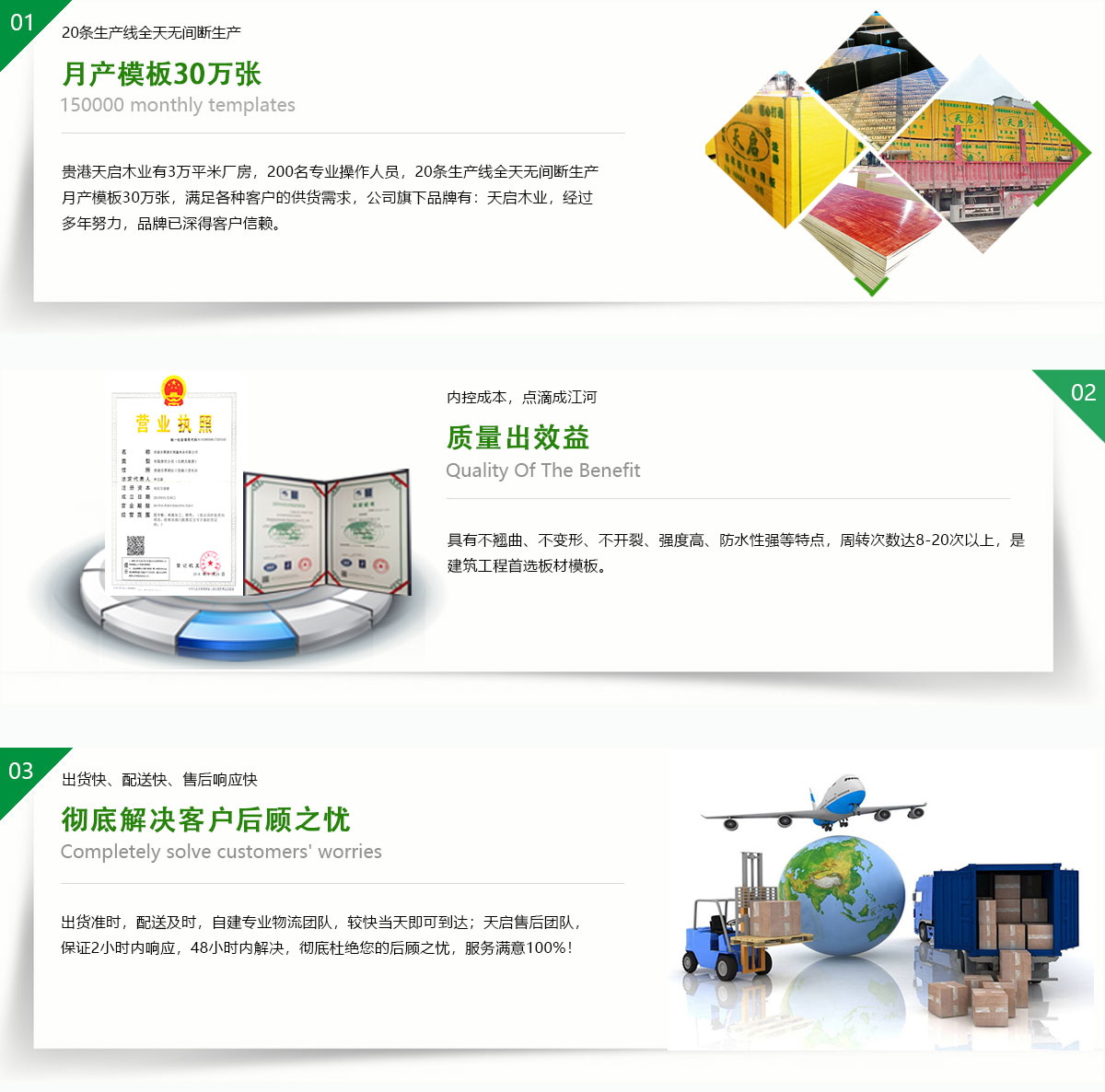 獨(dú)有對(duì)模板快速拆裝、重復(fù)使用、脫模效果好等優(yōu)勢(shì);天啟木業(yè)模板高端質(zhì)造的外表之下藏著一顆強(qiáng)大的實(shí)用匠心!